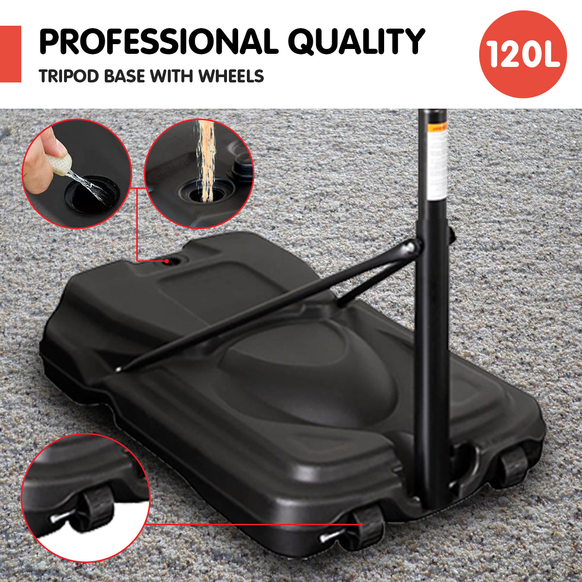 • 120L base can be filled with water or sand for stability