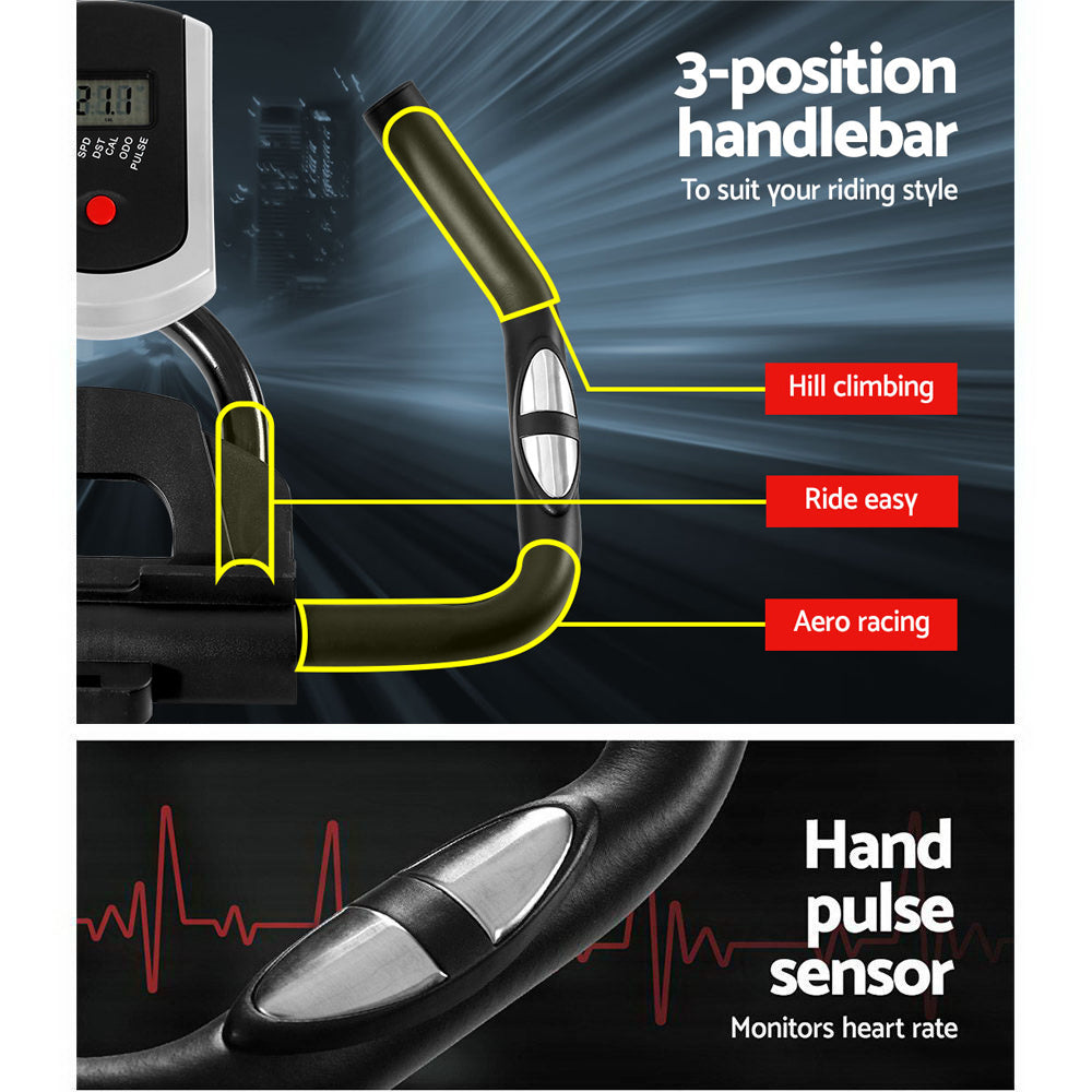 Now, nothing can stop your bike training regime. Not even bad weather. The Everfit Spin Bike helps to supplement your road biking sessions or lose some weight and get fit in the comfort of your home anytime. With a heavy-duty stainless steel 6kg flywheel and automotive-grade drive belt that delivers plenty of resistance via a control knob, the spin bike offers a smooth and noiseless workout. The frame itself is made of industrial-strength powder-coated steel for durable and robust use. Plus, an onboard computer with a LCD monitor assists in tracing six fitness parameters in one easy operation. The spin bike features an extra thick padded saddle seat that is fully adjustable in height and position. The handlebar is also adjustable to suit your handling comfort. Not least, the spin bike comes with non-slip feet pedals with straps and built-in transportation wheels for easy mobility.