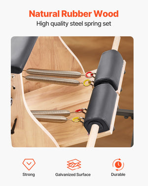 The yoga fitness trainer has a natural, sturdy rubberwood solid frame, with a 350 lbs weight capacity. It features a solid, durable design with upgraded metal rods and robust side adjustment bars to meet the needs of everyday training