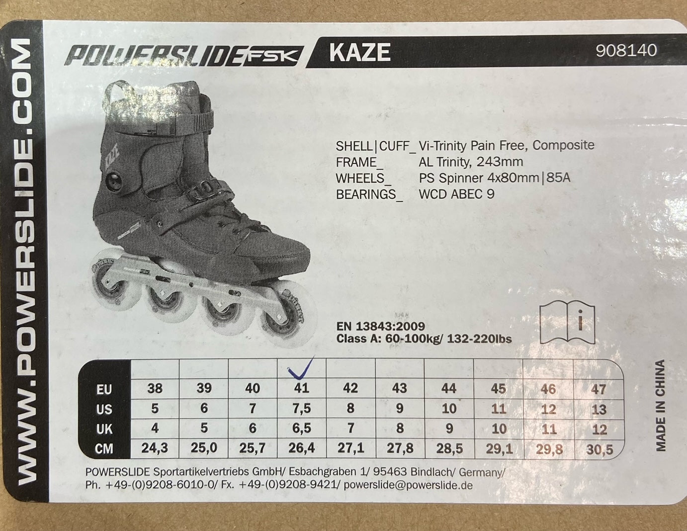 Wheels: Powerslide Spinner wheels, 76mm at a shoe size of 40-41 and 80mm at a shoe size of 42-46, 85A