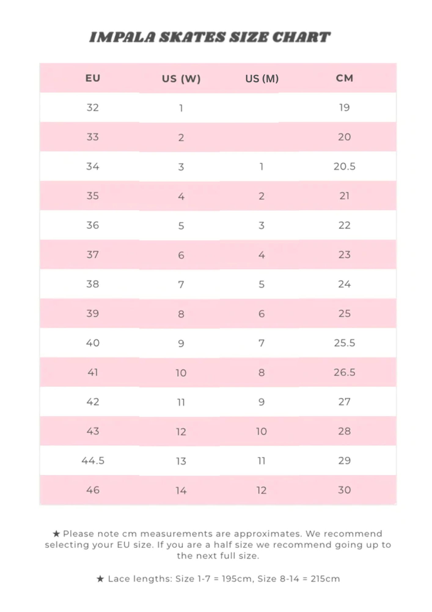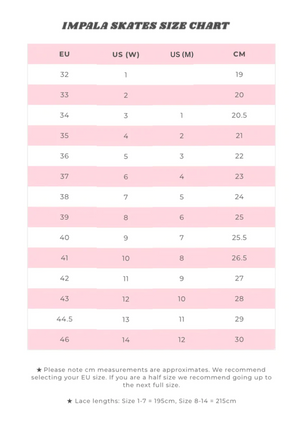 - This skate is in US ladies' sizing. Please check the size chart for your size. If unsure about sizing please stand on a ruler or tape measure, and call the shop.