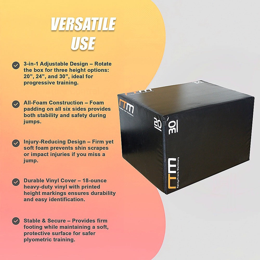 Each Jump Box features foam on all six sidesmaking these boxes firm and secure enough to perform challenging plyometric movements, but soft enough that you won't scrape your shins on the edges if you misstep. The box can also be quickly positioned at three different height settings20, 24, and 30. An 18-ounce vinyl is included with printed indications of which height you're using during your workout. The varying heights also make this 3 In 1 Games Box suitable for multiple fitness levels.