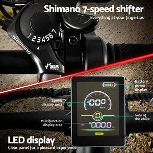 frame bike is easy to assemble, water-resistant, and perfect for mountain biking or exploring urban roads. The powerful 250W motor is paired with SHIMANO 21-speed gears and derailleur, making any terrain easy to tackle. With a 36V 10.4Ah removable rechargeable Li-ion battery, enjoy speeds up to 25km/h and a range of up to 60km on a single charge. Stay informed with the smart LED display panel and travel comfortably with the suspension front fork, height-adjustable saddle, and front and rear disc brakes. Our electric bike even comes with a built-in headlight and reflector for safe riding, while the durable wheels and tyres provide a smooth ride on a wide range of terrains. Suitable for riders with heights between 165-195cm and a weight capacity of 150kg. Charge time is between 6-8 hours. Get your electric mountain bike today for an unforgettable ride.