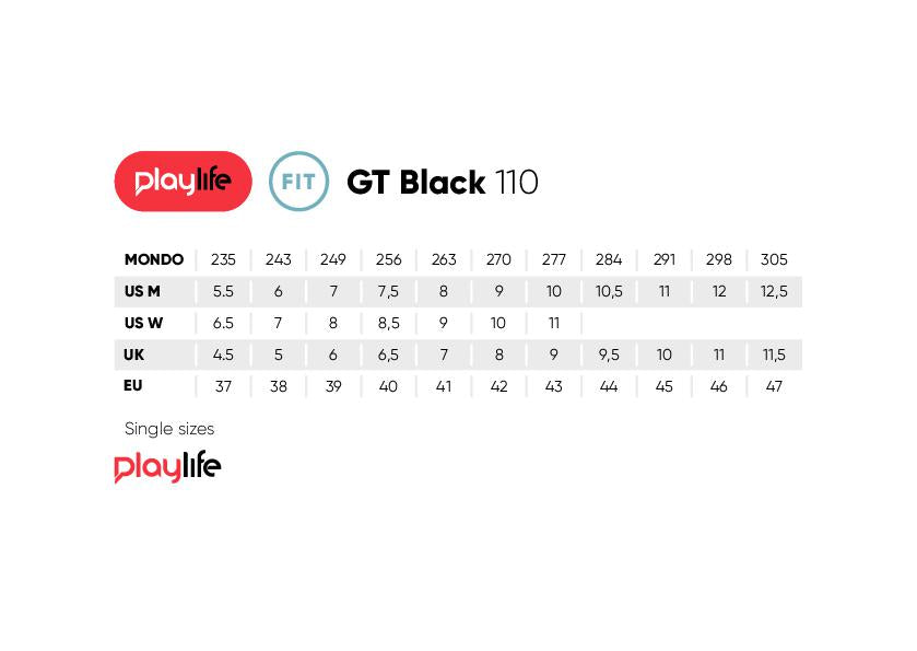 At PLAYLIFE, we believe everyone deserves to have high-quality inline skates for an affordable price. The GT Black 110 is a 3-wheel inline fitness skate with all the features you need for a fun day of rolling. The PLAYLIFE GT 110 is made with strong, durable materials with technologies and features normally found on more advanced skates, making this skate a fantastic value and ideal for beginners and intermediate skaters. This impressive soft boot inline fitness skate is light and comfortable, while its strong cuff provides excellent support. The GT 110 soft boot skates come equipped with dual-density padding that provides plenty of comfort and a closure system that includes both lacing and velcro straps, and a strong cuff strap that keeps your foot snugly in place. The PLAYLIFE GT Black 110 really is an excellent value, coming with a light and rigid 3D embossed aluminum frame that provides excellent power transfer and rides on fast 110mm wheels and smooth WICKED bearings. Complete with a heel brake for extra safety and control, the PLAYLIFE GT Black 110 is a fast, fun, and capable inline fitness skate at an affordable price point.