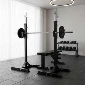 Get a hardcore workout in the comfort of your own home. It starts with the Squat Stands Pair.